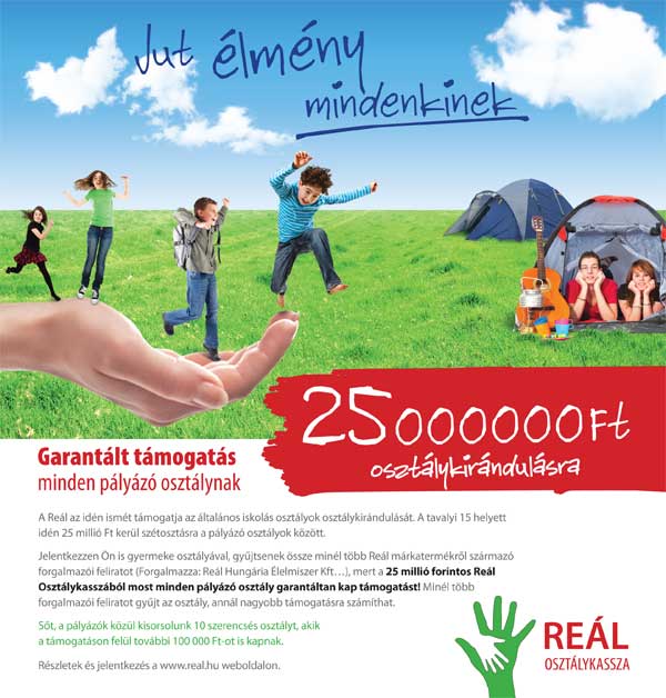 Kedves Szülők, Tanárok, Diákok! A Reál idén ismét támogatja az általános iskolás osztályok osztálykirándulását. Pályázzon a 25.000.000 Ft-os alapra a Reál márkatermékekről származó feliratok gyűjtésével! Válassza az Önhöz legközelebb eső Reál üzletet! További információt a www.real.hu oldalon találhatnak. Szentes, 2011. 09. 11.