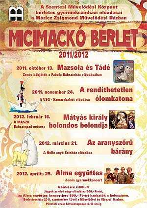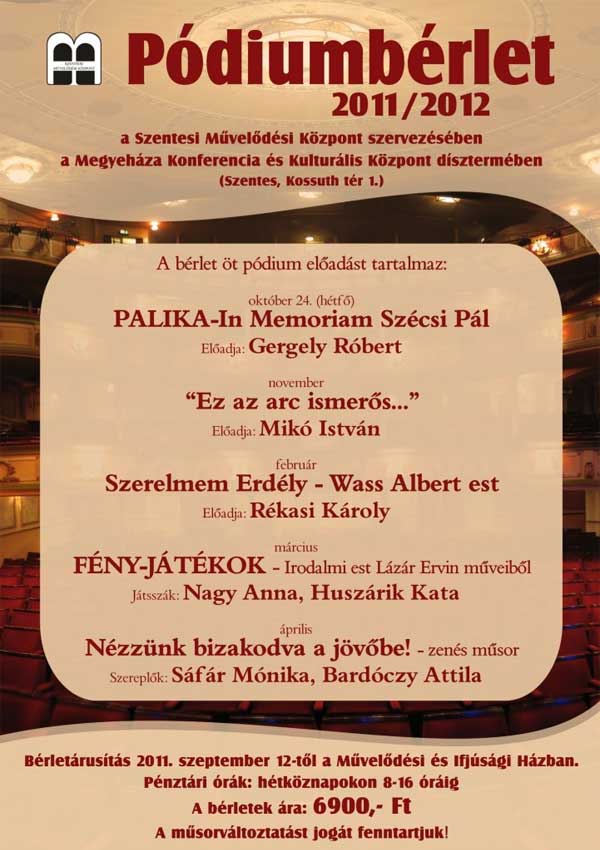 Bérletárusítás 2011. szeptember 12-től a Művelődési és Ifjúsági Házban. Pénztári órák: hétköznapokon 8-16 óráig. A bérletek ára: 6900,- Ft Az előadások 19 órakor kezdődnek és a Megyeháza Kulturális és Konferencia Központ nagytermében kerülnek bemutatásra. A műsorváltoztatás jogát fenntartjuk! Minden kedves látogatónak kellemes szórakozást kívánnak a Szentesi Művelődési Központ munkatársai!