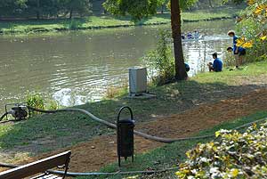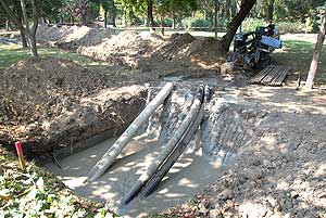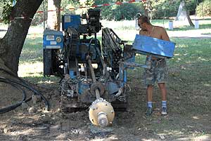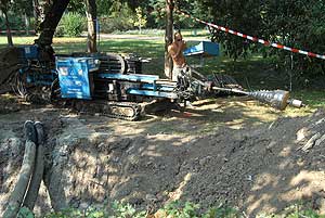 Biztos olajat keresnek - hallhattuk viccesen egy úszás órára igyekvő középiskolástól a ligetben, amikor megpillantotta a képen látható fura fúrójárgányt. Az olajkeresés nem vízszinteshez közeli fúrással történik, hanem függőlegessel. A munkások a Széchenyi ligetben éppen azon dolgoztak, hogy a Kurca alatt vezessenek át termálvíz csöveket (három darabot). Az Ilona-parttól a bíróság melletti hőközpontig dolgoznak a munkások és az eddigi legnagyobb akadályt is sikeresen vették, ami a Kurca volt. A mederfenék alatt 1,5-2 méterrel mélyebben vezették át a termálvíz csöveket.