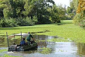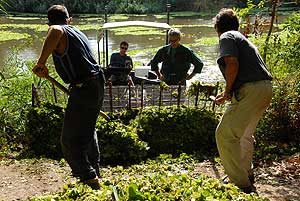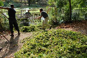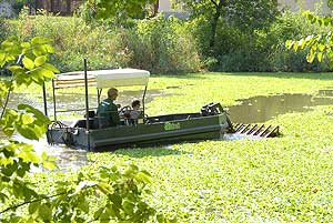 A Szalai hídtól északra csónakkal terelik a markolóhoz az úszónövényeket, a liget melletti szakaszon pedig egy speciális hajóval emelik ki a kagylótutajt.