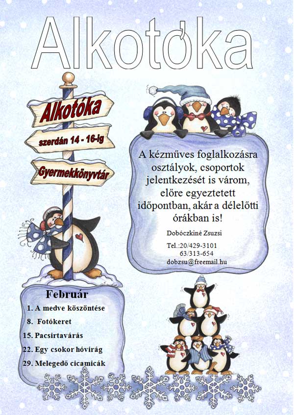 A Gyermekkönyvtárban működő Alkotóka kreativitásfejlesztő műhellyel kapcsolatban Dobóczkiné Zsuzsitól kérhető tájékoztatás (63/313-654).