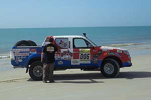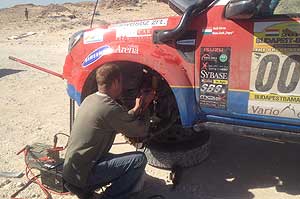 Egyszer észrevettük, hogy olyan érdekesen megy az autó. Pisti kiszállt megnézni: semmi. Gurulunk kb 5-6 métert és hopp, már gumi szag is van. Kiszálltunk és elég komoly baj tárult elénk: egy felső lengőkar törés. Hál’ istennek, nekünk nem lett bajunk, mivel történhetett volna a tegnapi gyors szakaszon 150 km/óra körül is. Egyből gondolkozás, mit tudunk csinálni, ahol a törvénytelenség az úr. Jöttek a csapattársak nagyon segítőkész volt mindenki. Különösen két csapat, akik kijelentették, hogy nem hagynak bennünket itt. Utána egy számomra hihetetlen dolog történt: hegesztés kettő db akkumulátorral, szöggel és dróttal. Ez sajnos nem volt olyan jó megoldás, de a helyszín mást nem engedett meg - két méter után ismét eltört. Utána jött egy norvég srác, hogy elvesztette az összes papírját pénzét és ő is a két határ közt rekedt. De ezt a dolgot egy kis törvénytelenséggel megoldottuk: a qvadját más vitte át a srác meg elbújt a buszban. Már csak az volt a kérdés, hogy mi mit csinálunk az autóval.