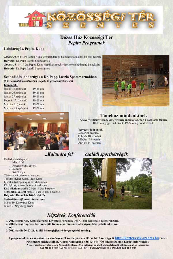 A Dózsa-házban található Közösségi tér az idei évben is számos programja várja a fiatalokat, érdeklődőket. A táncház és a családi napok mellett konferenciák és sportrendezvények várják 2012-ben is az érdeklődőket.