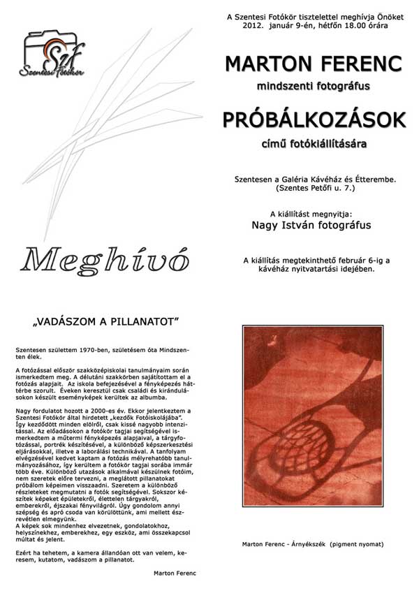 Marton Ferenc mindszenti fotós Próbálkozások című fotókiállítása nyílik meg Szentesen a Galéria Kávéház és Étteremben 20121. január 9-én, hétfőn 18 órakor. A kiállításon a Szentesi Fotókör tagjának az elmúlt években több képkészítési móddal készült fotóiból láthatunk válogatást.