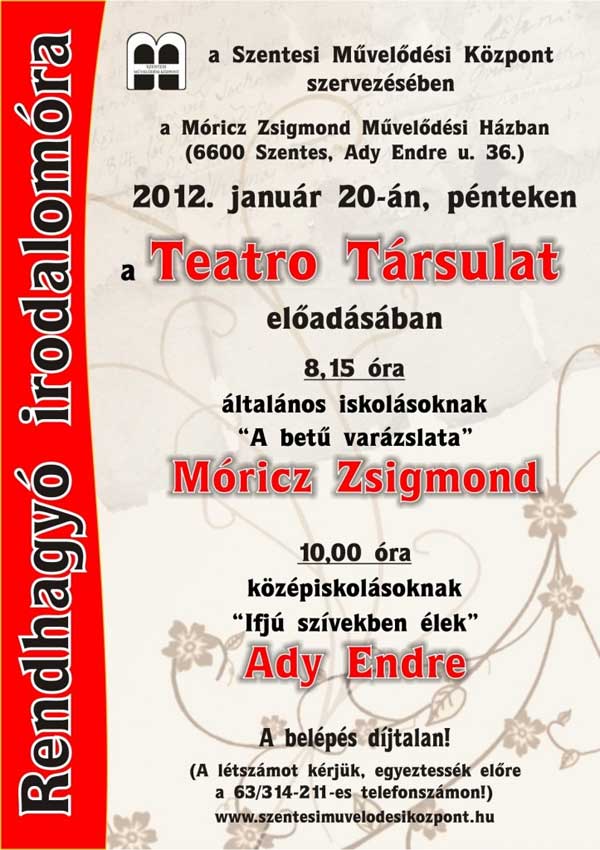 2012. január 20-án a Szentesi Művelődési Központ szervezésében a Magyar Kultúra Napja alkalmából rendhagyó irodalomórát szerveznek általános- és középiskolások számára a Móricz Zsigmond Művelődési Házban.