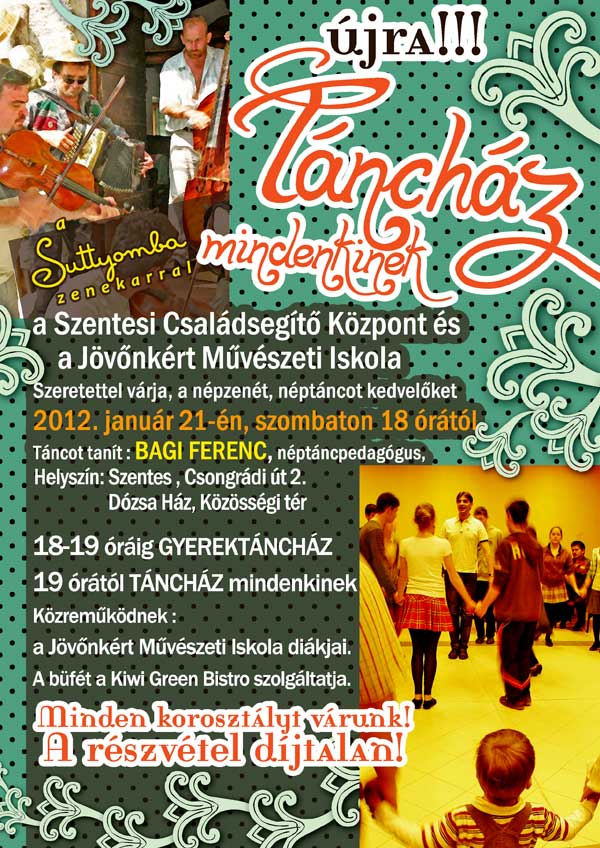 Újra táncházzal várják az érdeklődőket a Dózsa-ház Közösségi térbe. 2012. január 21-én a Suttyomba zenekar élő zenéjére járhatjuk a táncot a Szentesi Családsegítő Központ és a Jövőnkért Művészeti Iskola közös szervezésében. 18.00 órától indul a Gyermektáncház, majd este 7 órától várnak minden korosztályt. A rendezvényre a belépés díjtalan.