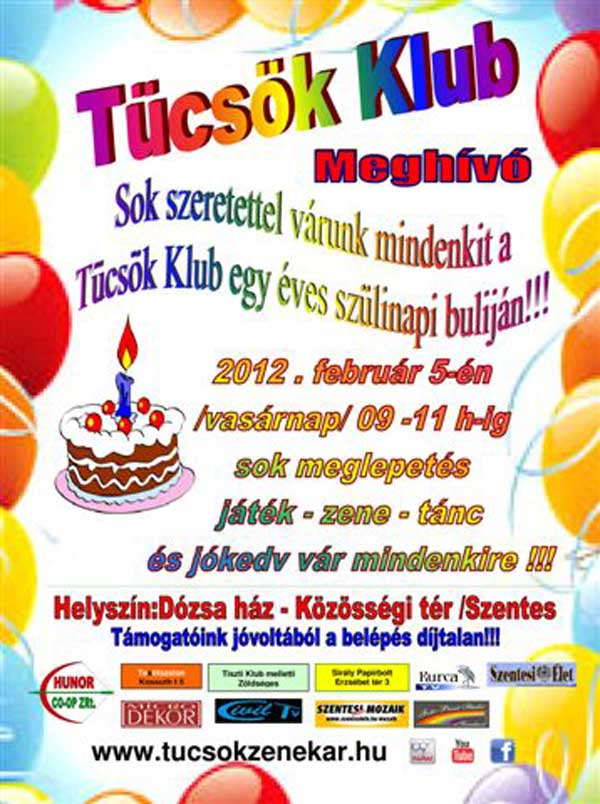 2012. február 5-én szülinapi bulira várják a kis tücsköket az egy esztendős Tücsök Klubba. A Dózsa ház Közösségi klubjában megrendezett zenés "táncos" délelőtt nagy kedvence a gyerkőcöknek. Biztos, hogy ezen a napon sok-sok meglepetéssel készülnek a Tücsök Klub szervezői a Tücsök Zenekar.