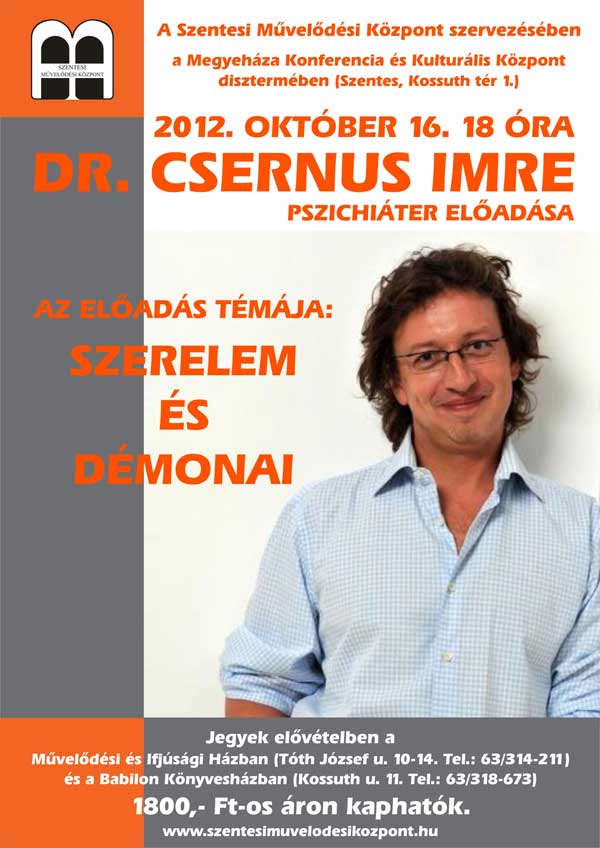 Október 1-től lehet jegyet váltani Dr. Csernus Imre pszichiáter előadására, mely 2012. október 16-án 18.00 órai kezdettel lesz a Megyeháza Konferencia és Kulturális Központ dísztermében.