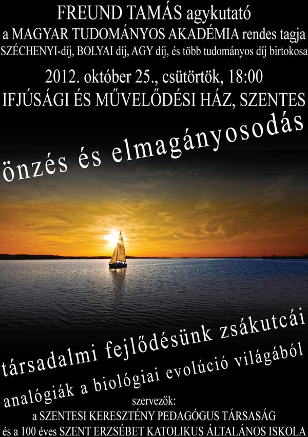 Freund Tamás agykutató előadására vár minden érdeklődőt a Szentesi Kereszténypedagógusok Társasága 2012. október 25-én 18.00 órai kezdettel a Művelődési és Ifjúsági Házba.