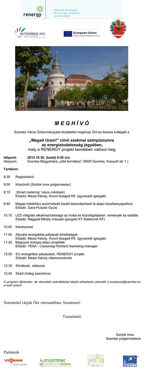 Szentes Város Önkormányzata tisztelettel meghívja Önt és kedves kollégáit a „Magad Uram!” című szakmai szimpóziumra az energiatudatosság jegyében, mely a RENERGY projekt keretében valósul meg. Időpont: 2012.10.30. (kedd) 9:00 óra Helyszín: Szentes Megyeháza „zöld termében” (6600 Szentes, Kossuth tér 1.)