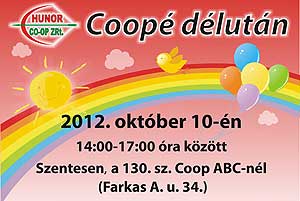 A Hunor Coop 2012. október 10-én Coopé délutánt rendez a Farkas A. utcai 130. sz. Coop ABC előtt. Az üzlet előtt felállított rendezvénysátorban sok-sok zenével, játékkal, vetélkedőkkel és kóstolókkal várják a gyerekeket és szüleiket.