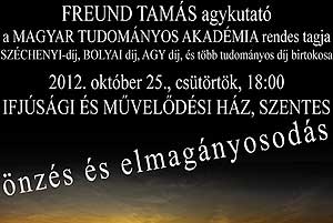 „Jó hangulat, hasznos munka… együtt!” – szólt a mottó, mellyel invitáltuk a lelkes környezetszépítő csapatokat idén másodjára, ezúttal október 6..-ára, akik – szabadidejüket feláldozva - jöttek és jelentkeztek szép számmal, segítségükkel a tervezett területen túl további kilométereket megtisztíthattunk. Csoportunk 6 fele oszlott és indult el a hűtőháztól a főútvonalak mentén. Az arra járók láthatták is munkánk eredményét: az út mentén sorakozó teli kék zsákokat. Katt a képre! Szentes, 2012. 10. 09. Freund Tamás agykutató előadása
