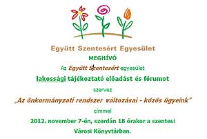 Az Együtt Szentesért egyesület lakossági tájékoztató előadást és fórumot szervez „Az önkormányzati rendszer változásai - közös ügyeink" címmel 2012. november 7-én, szerdán 18 órakor a szentesi Városi Könyvtárban. Előadók: Szirbik Imre polgármester és Dr. Sztantics Csaba jegyző Jöjjenek el, közös ügyeinket beszéljük meg! Katt a képre! Szentes, 2012. 10. 30. Kosztások a második helyen a magyar-lengyel történelemversenyen