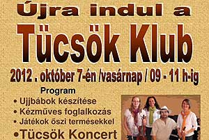 Sajnos rossz hír, hogy vége a nyárnak, viszont jó hír, hogy újra indul a Tücsök Klub. Sok szeretettel várnak mindenkit 2012. október 7-én /vasárnap/ 09-11 h-ig a szentesi Dózsa Ház-ba /Közösségi tér/ színes programokkal és persze Tücsök koncerttel. Részletes program a plakáton.