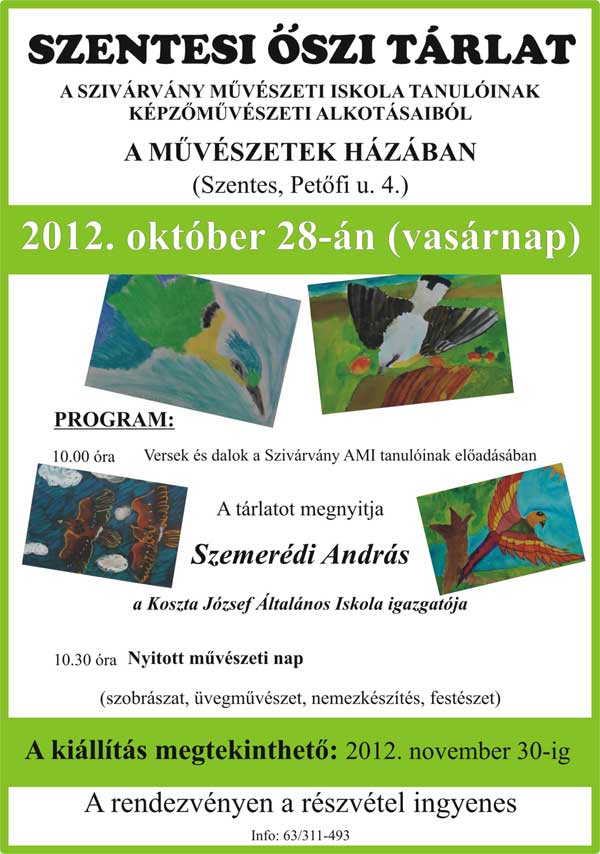 Program: 10.00 óra Versek és dalok a Szivárvány AMI tanulóinak előadásában A tárlatot megnyitja Szemerédi András a Koszta József Általános Iskola igazgatója 10.30 óra Nyitott művészeti nap (szobrászat, üvegművészet, nemezkészítés, festészet) A kiállítás megtekinthető: 2012. november 30-ig. A rendezvényen a részvétel ingyenes!