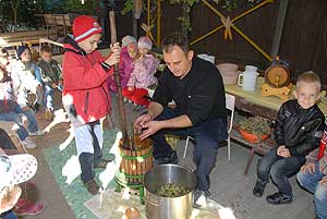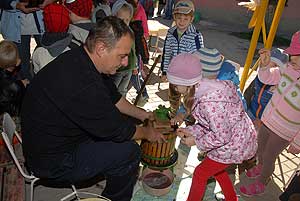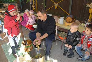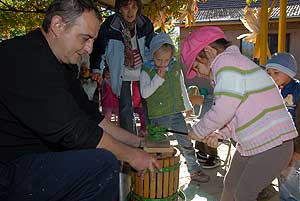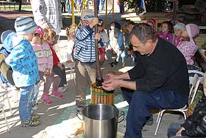 Mondanunk sem kell, hogy a szőlőpréselés keltette fel a legjobban a kicsik figyelmét, mert nem sűrűn találkozhatnak ilyen munkával a hétköznapokban. A gyerekek ismeretét ilyen és ehhez hasonló játékos délelőttökön igyekeznek bővíteni a népi hagyományokat tisztelő és követő Farkas Antal utcai óvodában.