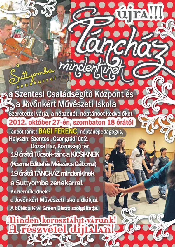 2012. október 27-én szombaton 18 órától táncházba várják a fiatalokat és az időseket a Dózsa Háznál. A Jövőnkért Alapfokú Művészeti Iskola az Ifjúsági Közösségi Tér munkatársaival közösen igyekszik újra meghonosítani Szentesen a táncház mozgalmat. Az őszi szezont ezen a hét végén kezdik, október 27-én este. 18 órától a Tücsök zenekar muzsikál a legkisebbeknek, 19 órától pedig a Suttyomba zenekar szolgáltatja a talpalávalót. A néptánc kedvelőivel Bagi Ferenc néptáncpedagógus foglalkozik. A részvétel díjtalan!