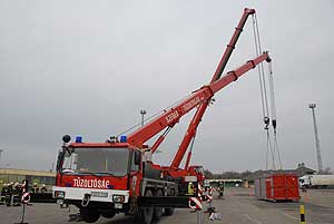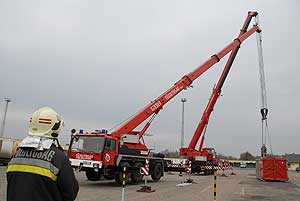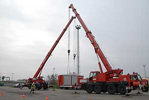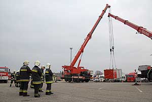 A Csongrád és a Jász-Nagykun-Szolnok Megyei Katasztrófavédelmi Igazgatóságok közös emelési gyakorlatán a jászsági 50 tonnás és a szegedi 30 tonnás daru kezelőszemélyzete közösen mozgatta a balestet szenvedett járművet modellező konténert. A gyakorlat különlegességét az adja, hogy bár egy-egy daru személyzete külön-külön többször is gyakorolhatja a mentéskor szükséges műveleteket, ritkábban adódik alkalom, hogy ezt közös irányítás alatt tegyék.