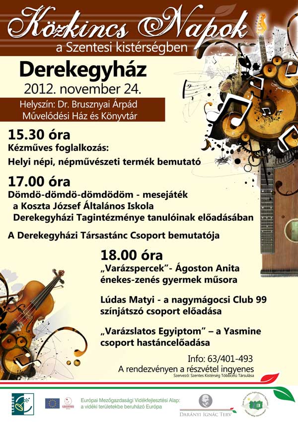 Derekegyházon lesz a „Közkincs Napok a Szentesi Kistérségben” elnevezésű kulturális programsorozat következő állomása 2012. november 24.-én szombaton. A 2012. október és 2013. március között megvalósuló rendezvénysorozat a kistérség nyolc településén, egy-egy kulturális találkozót fog össze egységes programmá. A fellépők amatőr kulturális csoportok lesznek. A műsorokat minden alkalommal kézműves foglalkozások, illetve képző- és iparművészeti tárlat is kíséri. A tervek szerint a fellépőket és a vendégeket palacsintával várják ezen a napon Derekegyházon.