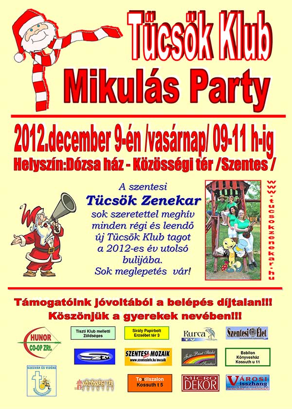 A szentesi Tücsök Zenekar szeretettel meghív minden régi és új Tücsök Klub tagot a 2012-es év utolsó bulijába 2012. december 9-én (vasárnap) 9.00-11.00 óra között a Dózsa ház Közösségi térben. Sok meglepetés vár mindenkire!
