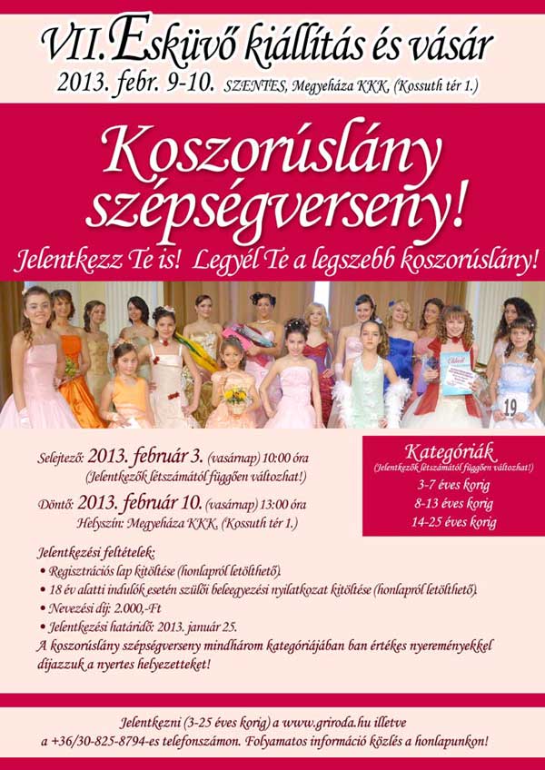 2013. február 9-10. között rendezik meg a Megyeháza Konferencia és Kulturális Központban a VII. Esküvő kiállítást és vásárt. A rendezvényen a számos program mellett koszorúslány szépségversenyt is rendeznek. A versenyre három kategóriában lehet nevezni: 3 – 7 éves korig, 8 – 13 éves korig és 14 – 25 éves korig.