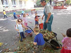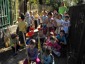 A takarítási Világnapon az óvoda udvarát és környékét varázsolták szebbé, tisztábbá gyermekek és felnőttek közösen. A gyermekek kis gereblyékkel, lombsöprűkkel, talicskákkal szorgoskodtak, élvezve a környezet szebbé tételének élményét. Ehhez a programhoz kapcsolódóan is a nagyok az óvoda kis kertjeit tették rendbe – ástak, gyomláltak, szamóca palántát ültettek. A szelektív hulladékgyűjtési munkában is közreműködtek, a szülők által gyűjtött alumínium dobozok taposását nagy élvezettel végezték a gyerekek.