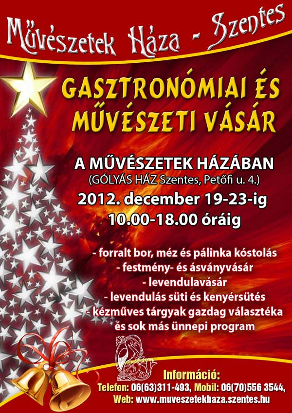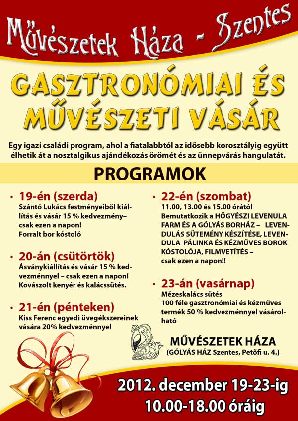 2012. december 19-23 között programokkal gazdagított Gasztronómiai és művészeti vásárba várják az érdeklődőket a Művészetek Házába (Gólyás ház, Szentes, Petőfi u. 4.).
