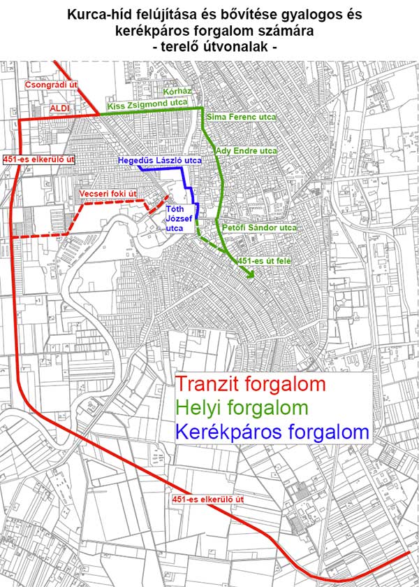 A forgalomtereléssel érintett közúti csomópontok: 1: Csongrádi út - Kiss Zsigmond u. – Aldi bekötőút a 451-es út felé; 2: Csongrádi út- Vecseri foki út a 451-es út felé; Kijelölt terelőút városközpont felé: Csongrádi út – Kiss Zsigmond utca – Sima Ferenc utca - Ady Endre u.- Kossuth tér. Kerékpáros, gyalogos forgalom terelése: 1: Csongrádi út – Hegedűs László u. – Tóth József utca – Erzsébet tér.