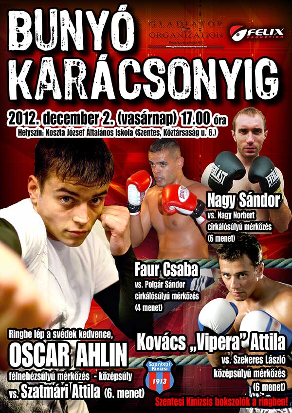 Lezajlott a Bunyó Karácsonyig elnevezésű boxgála mérlegelése. A KO király Nagy Sándor (91 kg. 6 meccs 6 KO győzelem) és a svéd Oscar Ahlin (81 kg. 5 meccs – 5 KO győzelem) sikerrel hozta a súlyát, és már csak a ringben kell bizonyítaniuk.