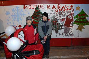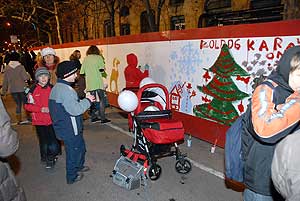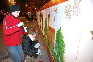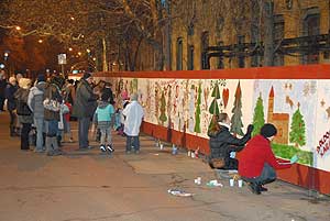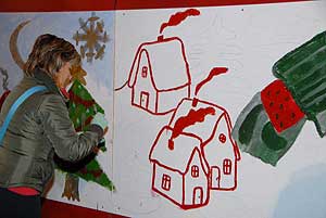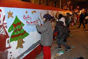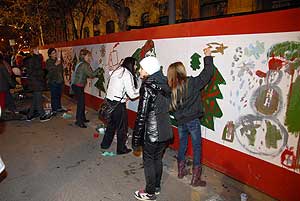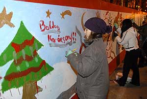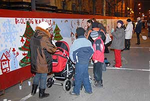 Akciót hirdettek, kicsiknek és nagyoknak, hogy fessék meg karácsonyi gondolataikat a palánkra felhelyezett fehér lapokra.