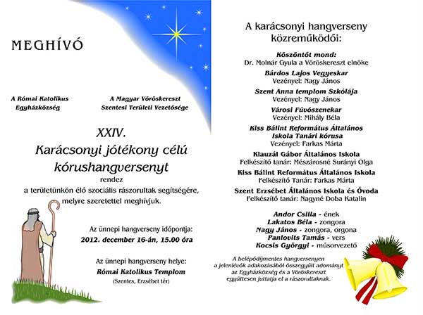 Huszonnegyedik alkalommal rendezte meg a Római Katolikus Egyházközség és a Magyar Vöröskereszt szentesi területi vezetősége a karácsonyi jótékony célú kórushangversenyét a területünkön élő szociális rászorultak megsegítésére. 2012. december 16-án a Szent Anna templomba 15.00 órai kezdettel Dr. Molnár Gyula a Vöröskereszt elnöke mondott köszöntőt.