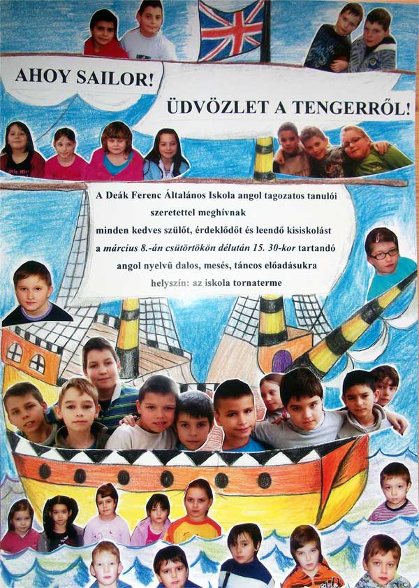 A Deák Ferenc Általános Iskola angol tagozatos tanulói szeretettel meghívnak minden kedves szülőt, érdeklődőt és leendő kisiskolást a 2012. március 8-án csütörtökön délután 15.30-kor tartandó angol nyelvű dalos, mesés, táncos előadásukra az iskola tornatermébe.