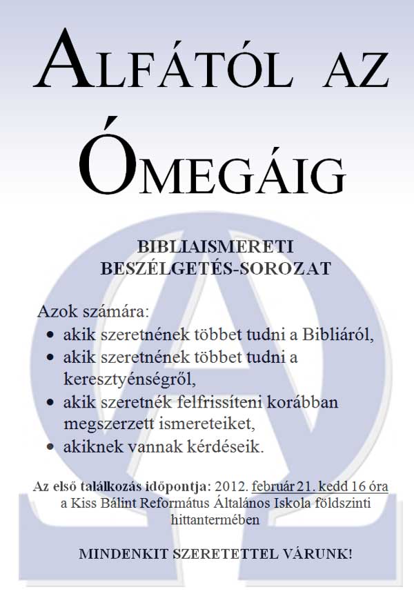 ALFÁTÓL AZ ÓMEGÁIG BIBLIAISMERETI BESZÉLGETÉS-SOROZAT veszi kezdetét 2012. február 21. kedden 16 órakor a Kiss Bálint Református Általános Iskola földszinti hittantermében. Ajánljuk mindazoknak, akik szeretnének többet tudni a Bibliáról, - akik szeretnének többet tudni a keresztyénségről, - akik szeretnék felfrissíteni korábban megszerzett ismereteiket, és akiknek vannak kérdéseik.
