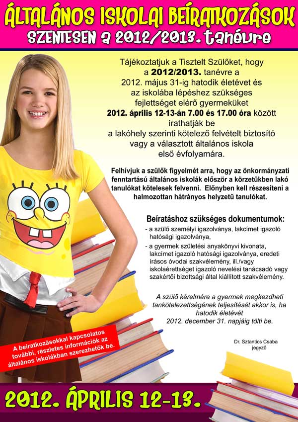 ÁLTALÁNOS ISKOLAI BEIRATKOZÁSOK SZENTESEN a 2012/2013. tanévre