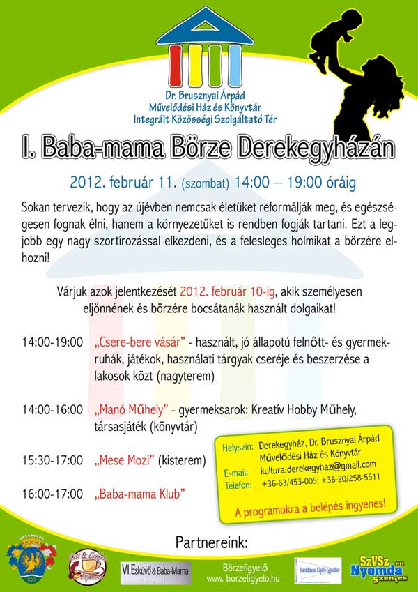 Sokan tervezik, hogy az újéveben nemcsak életüket reformálják meg és egészségesen fognak élni, hanem a környezetüket is rendben fogják tartani. Ezt a legjobb egy nagy szortírozással elkezdeni és a felesleges holmikat a derekegyházi Baba-mama Börzére elhozni. Míg a szülők börzéznek, a gyermekeket játékos programok várják a Dr. Brusznyai Árpád Művelődési Házban.