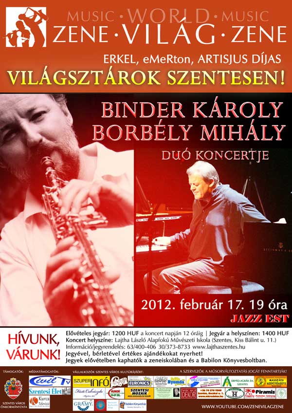 2011.02.17. (péntek) 19 óra ERKEL, eMeRton, ARTISJUS DÍJAS VILÁGSZTÁROK SZENTESEN! BINDER KÁROLY - BORBÉLY MIHÁLY DUÓ KONCERTJE - JAZZ EST