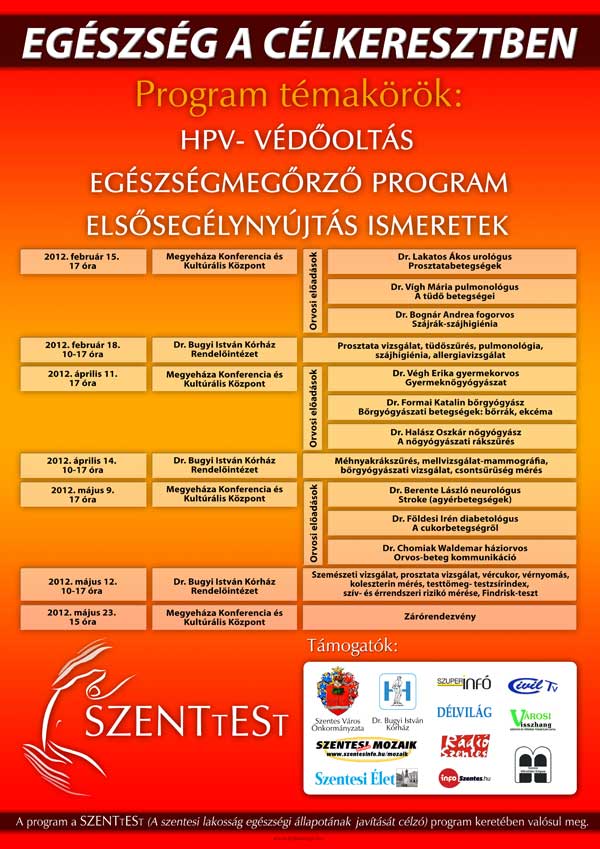 Előadással és orvosi vizsgálatokkal folytatódik az Egészség a célkeresztben lakossági szűrőprogram. Február 15-én, szerdán 17 órakor a Megyeháza Kulturális és Konferencia Központban tart előadást a prosztata betegségekről dr. Lakatos Ákos urológus főorvos, a tüdőbetegségekről dr. Vigh Mária főorvos, a szájhigiéniáról dr. Bognár Andrea főorvos. Február 18-án, szombaton 10 és 17 óra között a Dr. Bugyi István Kórház Rendelőintézetében ingyenes lakossági szűrések lesznek, köztük prosztata-, tüdőszűrés, allergiológiai és légzésfunkció vizsgálat, valamint szájrák szűrés.
