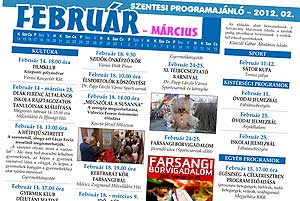 A hétvégén jelenik meg a Szentesi Programajánló 2012. februári száma, mely a következő hónap programjait, rendezvényeit hivatott népszerűsíteni. Az összeállításban részletesen megtalálhatjuk a következő hónapnak a helyi zenei, színházi, sport és egyéb szórakoztató rendezvényeit és azok helyszínét és időpontját. Év elejétől annyiban változik a Programajánló megjelenése, hogy nem a Szentesi Élet Horizont magazinjában olvashatják a következő hónap programját, hanem a FÓR magazinban jelenik meg.