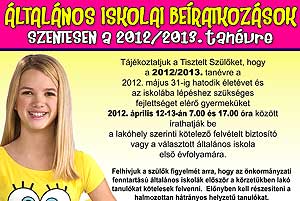 Tájékoztatjuk a Tisztelt Szülőket, hogy a 2012/2013. tanévre a 2012. május 31-ig hatodik életévet és az iskolába lépéshez szükséges fejlettséget elérő gyermeküket 2012. április 12-13-án 07.00 és 17.00 óra között írathatják be a lakóhely szerinti kötelező felvételt biztosító vagy a választott általános iskola első évfolyamára.