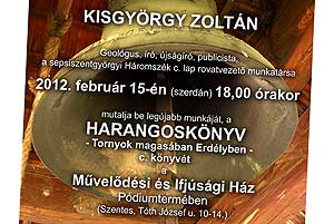 A Krúdy Gyula Baráti Kör és a Szentesi Művelődési Központ meghívására érkezett Kisgyörgy Zoltán geológus, író, újságíró, publicista, a sepsiszentgyörgyi Háromszék c. lap rovatvezető munkatársa 2012. február 15-én Művelődési és Ifjúsági Házba, hogy legújabb munkáját, a HARANGOSKÖNYV - Tornyok magasában Erdélyben c. könyvét bemutassa a szentesi olvasóknak. A könyvbemutatón készült videó részletet a képre kattintva tekintheti meg! Katt a képre! Szentes, 2012. 02. 16. Esküvő kiállítás & Konty Show