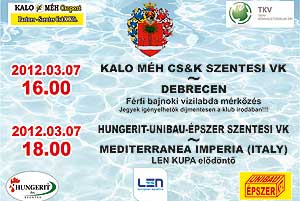 A Hungerit-UniBauÉpszer Szentesi VK női vízilabdacsapata a LEN-kupa-elődöntő első meccsén holnap 20 órakor az olasz Mediterranea Imperia vendégeként játszik. Az elődöntőt az olasz Mediterranea Imperia ellen vívják a Kurca-partiak, az első találkozót február 29-én 20 órától rendezik Imperiában, a visszavágót március 7-én Szentesen. A Hungerit-UniBauÉpszer már eddigi LEN-produkciójával jelezte, továbbra is az európai elitbe tartozik. 2012. március 7-én a fiú csapat a Kalo Méh Cs&K Szentesi VK is vízbe száll. A női meccs előtt 16.00 órakor a Debrecen csapatát fogadják a szentesi strandon bajnoki mérkőzésen.