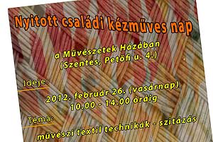 2012. február 26-án (vasárnap) Nyitott családi kézműves napra várják az érdeklődőket a Művészetek Házába, ahol Varga Anikó designer, a Moholy-Nagy Művészeti Egyetem tanárának vezetésével ismerkedhetünk meg a művészi textil technikák közül a szitázással.