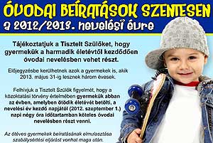 Tájékoztatjuk a Tisztelt Szülőket, hogy gyermekük a harmadik életévtől kezdődően óvodai nevelésben vehet részt. Előjegyzésbe kerülhetnek azok a gyermekek is, akik 2013. május 31-ig lesznek három évesek. Felhívjuk a Tisztelt Szülők figyelmét, hogy a közoktatási törvény értelmében gyermekük abban az évben, amelyben ötödik életévét betölti, a nevelési év kezdő napjától (2012. szeptember 1.) napi négy óra időtartamban köteles óvodai nevelésben részt venni. Az ötéves gyermekek beíratásának elmulasztása szabálysértési eljárást vonhat maga után. Katt a képre! Szentes, 2012. 02. 28. UTAZÁS 2012