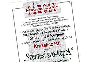 A Magyar Király Páholy a Magyar Irodalomtörténeti Társaság Csongrád Megyei Szervezete és Szépírói Tagozata, a Csongrádi Városkép Nonprofit Kft. Művelődési Központja, a Faludy György Irodalmi MŰHELY tisztelettel meghívja Önt és kedves családját 2012. február 22-én szerdán 17 órára a Művelődési Központ emeletére (Csongrád, Szentháromság tér 8.) Kruzslicz Pál Szentesi szó-képek „A művelődés szentesi otthonai" című új köteteinek bemutatójára.