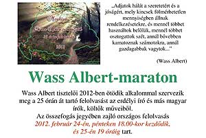 Wass Albert tisztelői 2012-ben ötödik alkalommal szervezik meg a 25 órán át tartó felolvasást az erdélyi író és más magyar írók, költők műveiből. Az összefogás jegyében zajló országos felolvasás 2012. február 24-én, pénteken 18.00-kor kezdődik, és 25-én 19 óráig tart. Szentes is csatlakozik a Szentesi Keresztény Pedagógus Társaság szervezésében. Helyszín: Pepita Macska Klub (Csongrádi Út 2. Dózsa-ház). Célszerű 5-6-7 oldalas prózarészletek illetve bármely hosszú versek felolvasásával készülni.