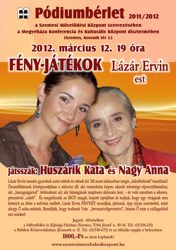2012. március 12-én FÉNY – JÁTÉKOK címmel láthatjuk a Szentesi Művelődési Központ Pódium bérletének következő előadását melyben Nagy Anna és Huszárik Kata színművészek előadásában LÁZÁR ERVIN (felnőtt) műveiből hallhatunk részleteket.