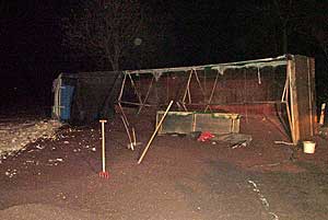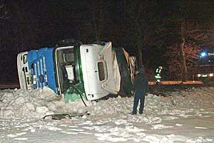 Éjfél előtt nem sokkal egy nyerges vontató haladt a 45-ös főúton Szentes felől Kunszentmárton irányába, amikor a síkos úton megcsúszott és lekapott az útról, majd onnan visszatérve a menetirány szerinti bal oldalon lévő útpadkának hajtott ,és az oldalára borult. A jármű repcét szállított, amely a felborulás következtében az úttestre szóródott. A balesetben a sofőr sérült meg súlyosan, kéztöréssel kórházba szállították a mentők. Az érintett útszakaszon a műszaki mentés idejére teljes útzár volt érvényben, amit reggel 5 órakor oldottak fel. A rendőrség a forgalmat Szarvas és Nagytőke irányába terelte.