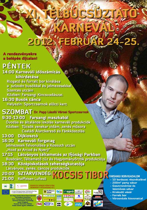 2012. február 24-25. között ismét megrendezésre kerül a Télbúcsúztató Karnevál. Egyre több érdeklődő, egyre több támogató, egyre több helyszín, egyre több program. Szombat este 20.00-kor a Sportcsarnokban sztárvendégünk Kocsis Tibor, az X-faktor 2011-es szériájának győztese. A rendezvényre a belépés díjtalan, ám korlátozott, ezért szombat este szabadtéri kivetítés is segíti a Karnevál sikerét. Régi és új fellépőkkel, ingyenes fánkkóstolással, az elmaradhatatlan farsangi maskarás felvonulással és busók produkciójával, régi és új kiegészítő programokkal vár minden érdeklődőt Szentesen a XI. Télbúcsúztató Karnevál! További információk a plakátokon.