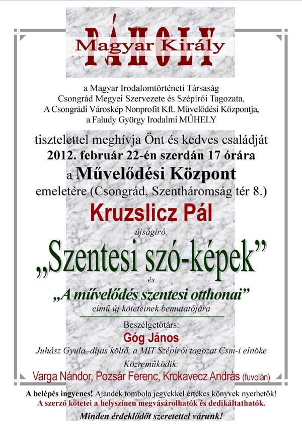 A Magyar Király Páholy a Magyar Irodalomtörténeti Társaság Csongrád Megyei Szervezete és Szépírói Tagozata, a Csongrádi Városkép Nonprofit Kft. Művelődési Központja, a Faludy György Irodalmi MŰHELY tisztelettel meghívja Önt és kedves családját 2012. február 22-én szerdán 17 órára a Művelődési Központ emeletére (Csongrád, Szentháromság tér 8.) Kruzslicz Pál Szentesi szó-képek „A művelődés szentesi otthonai" című új köteteinek bemutatójára. Beszélgetőtárs: Góg János Juhász Gyula—díjas költő, a MIT Szépírói tagozat Csm-i elnöke.