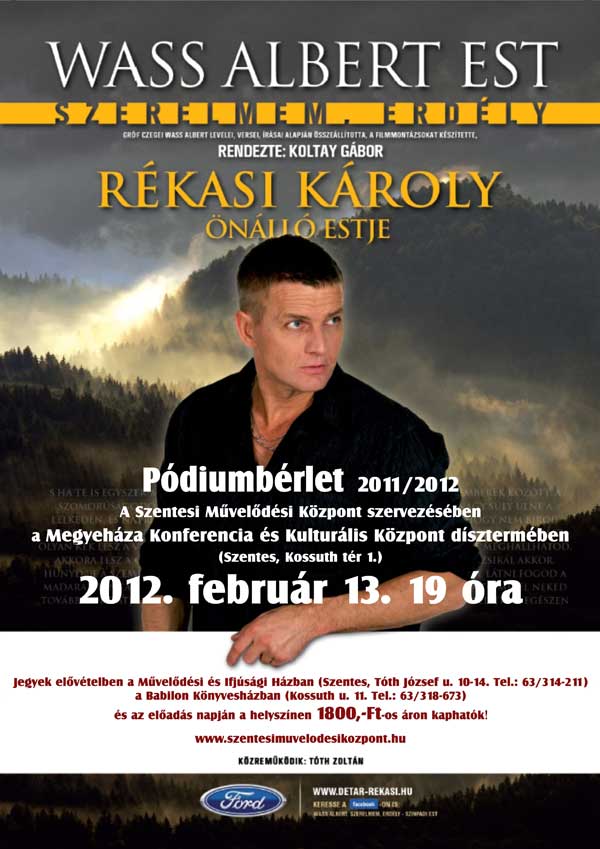 2012. február 13-án Wass Albert estre várják az érdeklődőket a Megyeháza dísztermébe. Koltay Gábor rendezését Rékasi Károly adja elő önálló est keretében. Az előadóest főszereplője nem kifejezetten Wass Albertet, az írót személyesíti meg, hanem egy mai fiatalembert, aki a Wass Albert szövegekben, az író gondolatvilágában búvárkodva, belehelyezkedve a fizikai és lelki értelemben is rendkívül összetett és bonyolult élethelyzetbe, megpróbálja megérteni az író szándékait és felmutatni azokat az értékeket, amelyek miatt oly fontossá vált ez az életmű az elmúlt húsz évben, önazonosságát, identitását kereső mai világunkban.